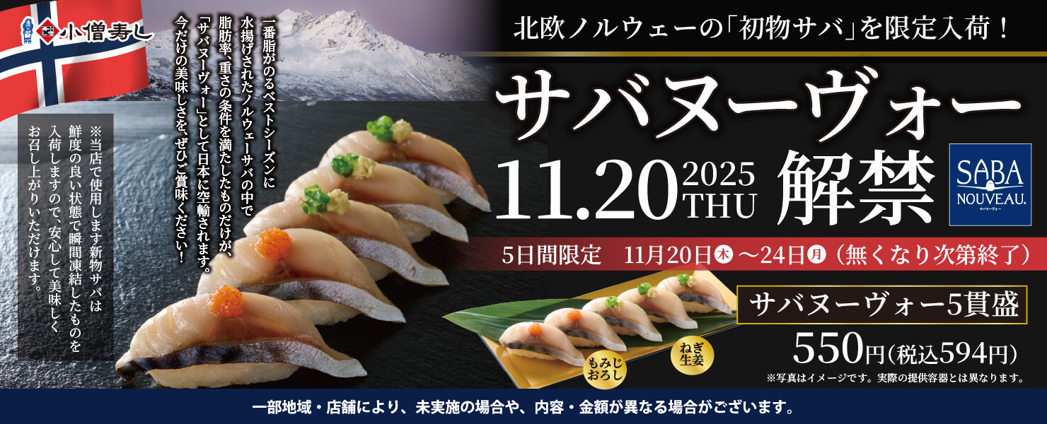 2025年11月20日(木)解禁!初物サバ『サバヌーヴォー』フェア(店舗により未実施の場合がございます)